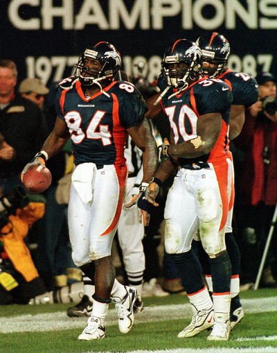 | Shannon Sharpe and Terrell Davis walk out of the endzone together after taking the lead late in the 4th quarter. Notice the sign in the background, need I say more! | #84 #30 | Click Here! |