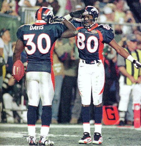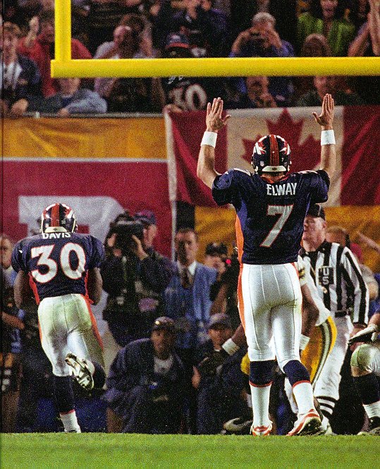 John Elway signals TOUCHDOWN as Davis makes his 3rd of the day!