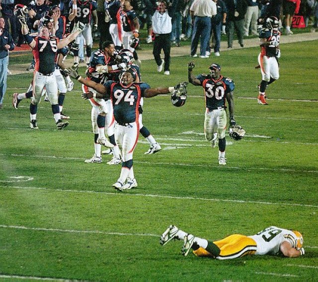The Broncos celebrate as they become the SuperBowl XXXII Champions!
