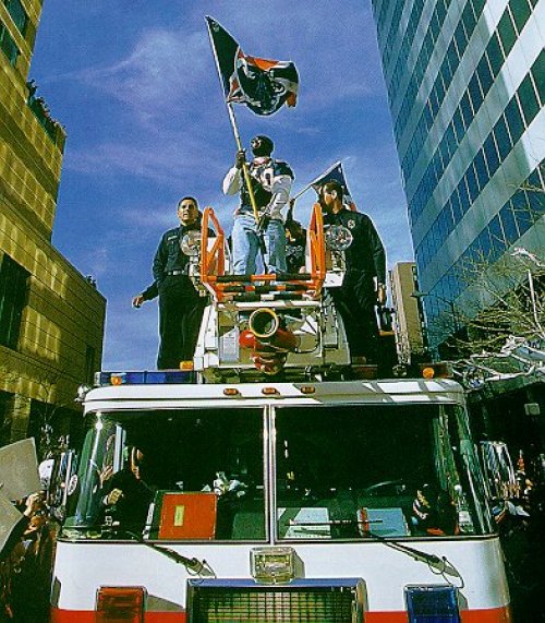Terrell Davis waves a Broncos flag during the parade in Denver!