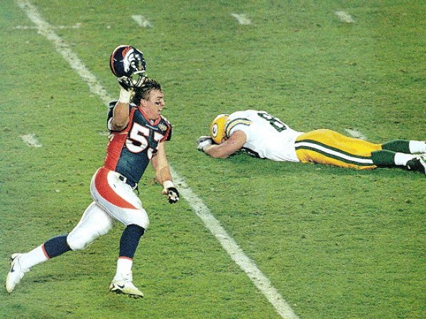 Bill Romanowski raises his helmet in celebration of the Broncos victory!