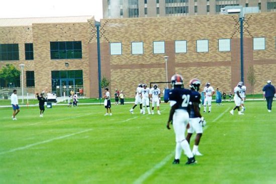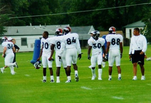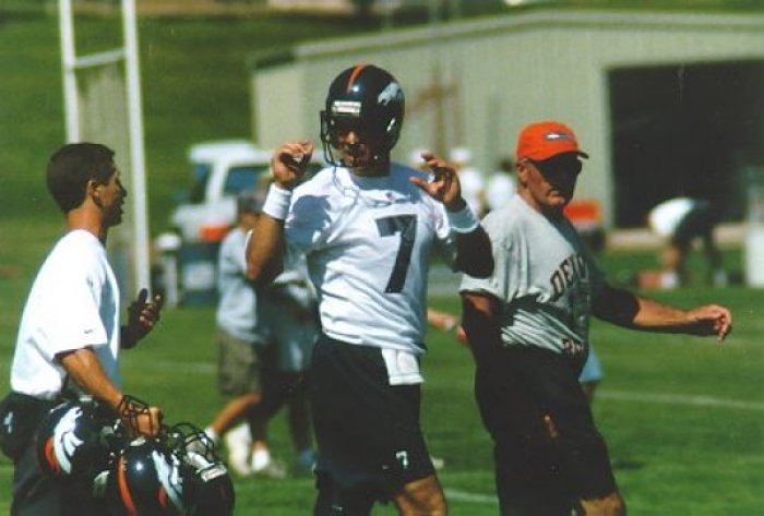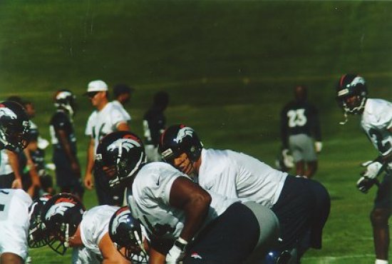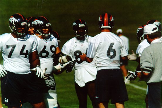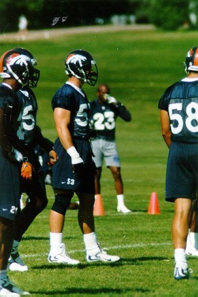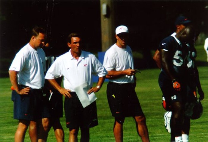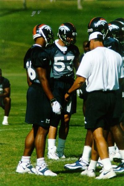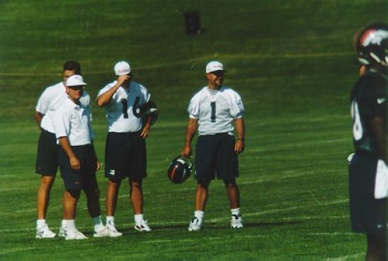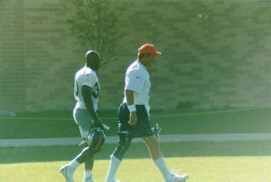 Jason Elam and Tom Rouen hanging out on the sideline watching practice ...
