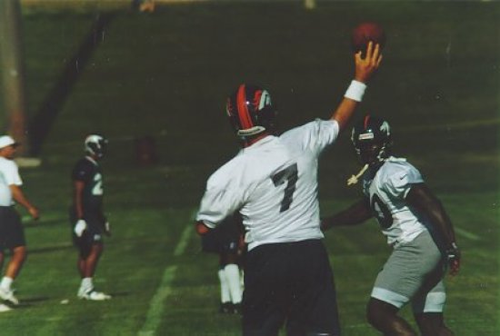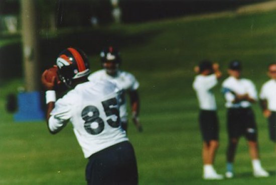 Willie Green snags a hot pass from Elway during scrimmage drills ...