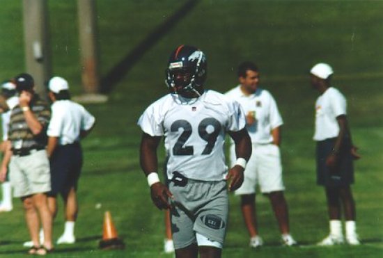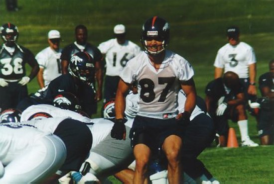 Ed McCaffrey going in motion as they run some offensive drills ...