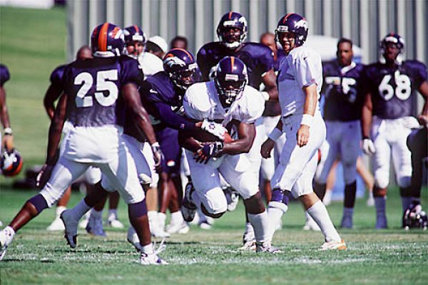 Elway hands off to Davis on a running play during practice scrimmage ...